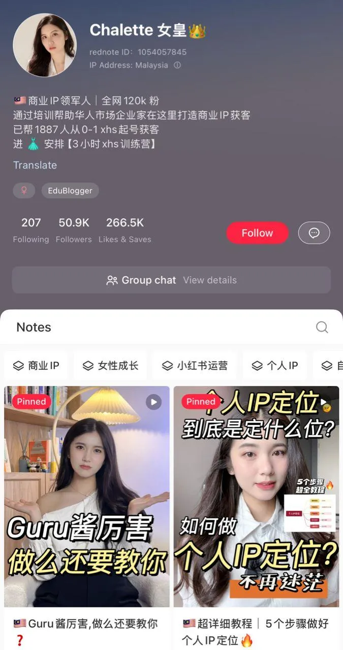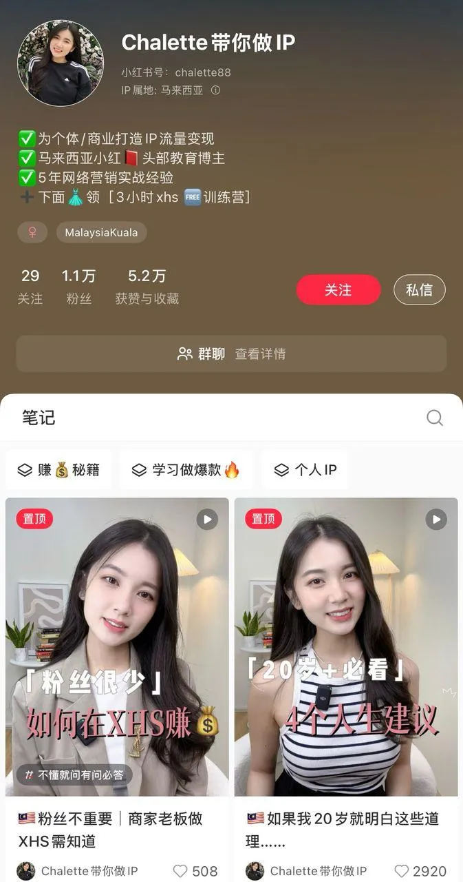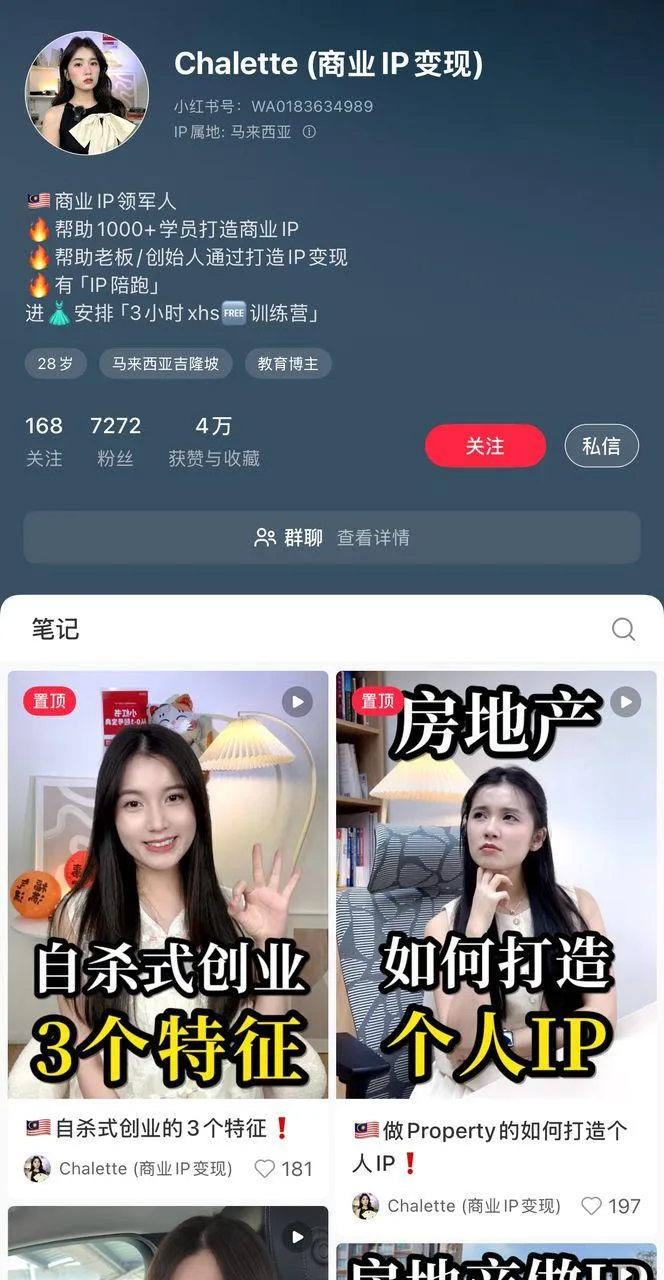 "跟着Chalette老师的方法做内容,视频放去小红书1000+小眼睛,一下就5个咨询,现在我已经通过小红书变现RM30k。"